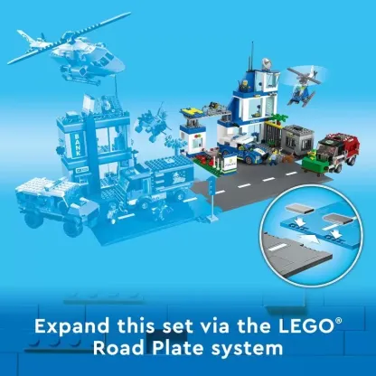 - What’s in the box? – Everything kids need to build a 3-level police station, patrol vehicle, helicopter and garbage truck, plus a dog figure and 5 minifigures, including 3 LEGO® City TV characters