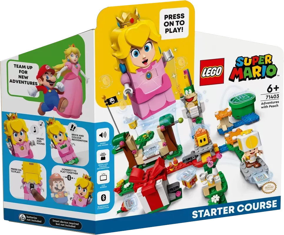 Team up – The LEGO® Peach™ figure requires 2 x AAA batteries (not included) and can connect via Bluetooth with LEGO® Luigi™ or LEGO® Mario™ (extra figures not included) for 2-player social play