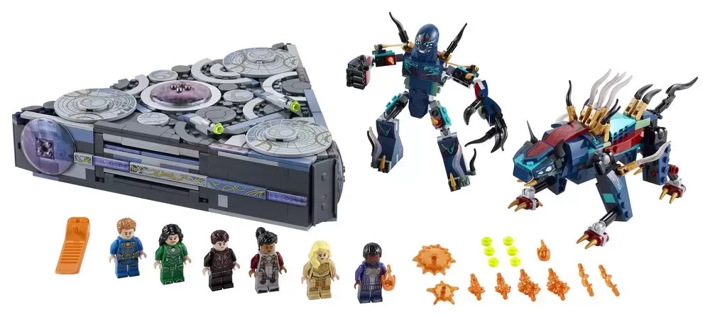 - Includes 6 minifigures – Makkari, Ikaris, Thena, Sersi and the exclusive Druig and Phastos – 2 Deviant action figures, including Kro, the Deviant leader, a spaceship, weapons and accessories.
